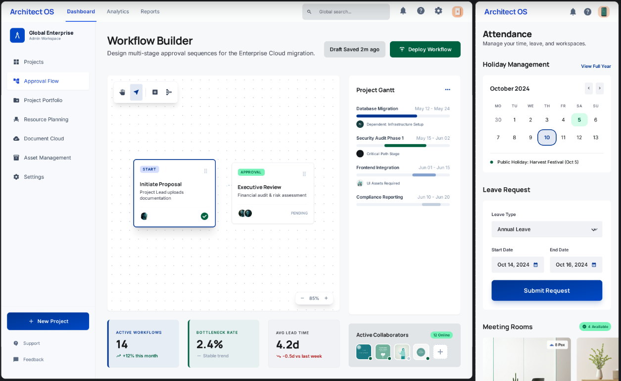 针对复杂组织架构定制的审批流、项目协作及考勤管理系统。支持跨部门高效协同,集成即时通讯与云文档管理,助力企业构建数字化办公闭环,大幅降低沟通成本。