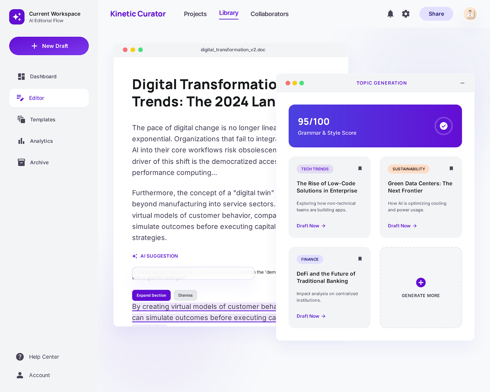 深度整合前沿大模型技术,为企业提供智能选题、一键成稿、多维度语法优化等功能。助力内容团队快速产出高质量文章,在保证内容原创性的同时大幅缩短创作周期。